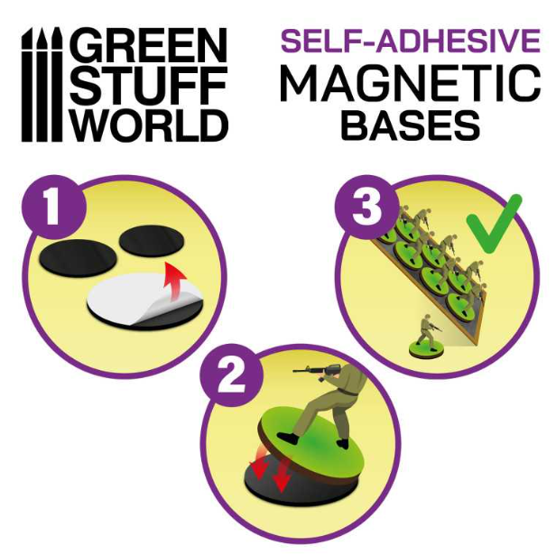 Use them alone, together with our rubber steel sheets, or together with our Neodymium Magnets depending on the attraction strength needed. Using magnetically-based figures allows you to field large units on the tabletop on their movement trays as one item. This removes the time spent moving figures one-by-one across the table. Even if the trays are knocked or tipped, you have a good chance of your figures staying attached and undamaged. Applying is very easy. Simply take the protective paper off the underside of the magnetic foil and stick it to the bottom of the bases.