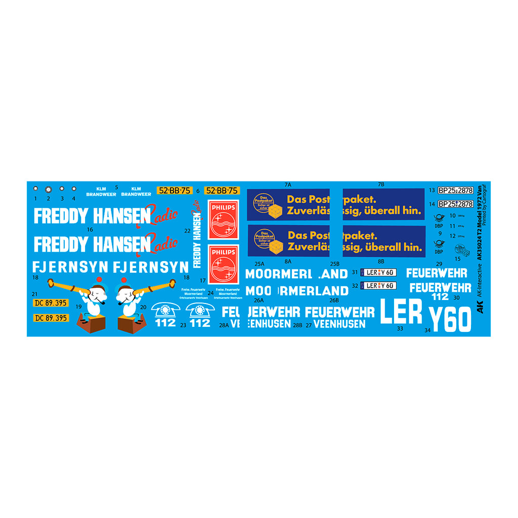 van is now an icon of the automotive industry. It was used for decades for military and civilian tasks, and is still in service in many countries.The reference AK35024 represents the closed version of the vehicle with external modifications introduced in 1972, used by i.e. fire department units, postal operators and commercial brands. Includes decorations for different vehicles and sirens for the firefighter versions. The modeler can make different changes in the kit and easy variations to match different configurations seen through the years in different countries or different civilian versions. It is a perfect kit to build out of box or to update and adapt to our own version and allows a multitude of possibilities in any scene.